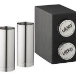 Koivu-ukko sisältää meijeriteräksiset snapsilasit 2 kpl, jotka ovat tumman visakoivuisen säilytyslaatikon sisässä.