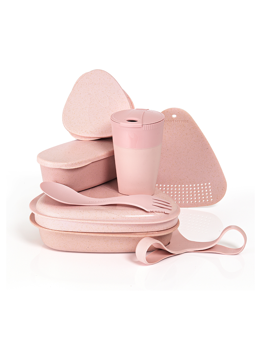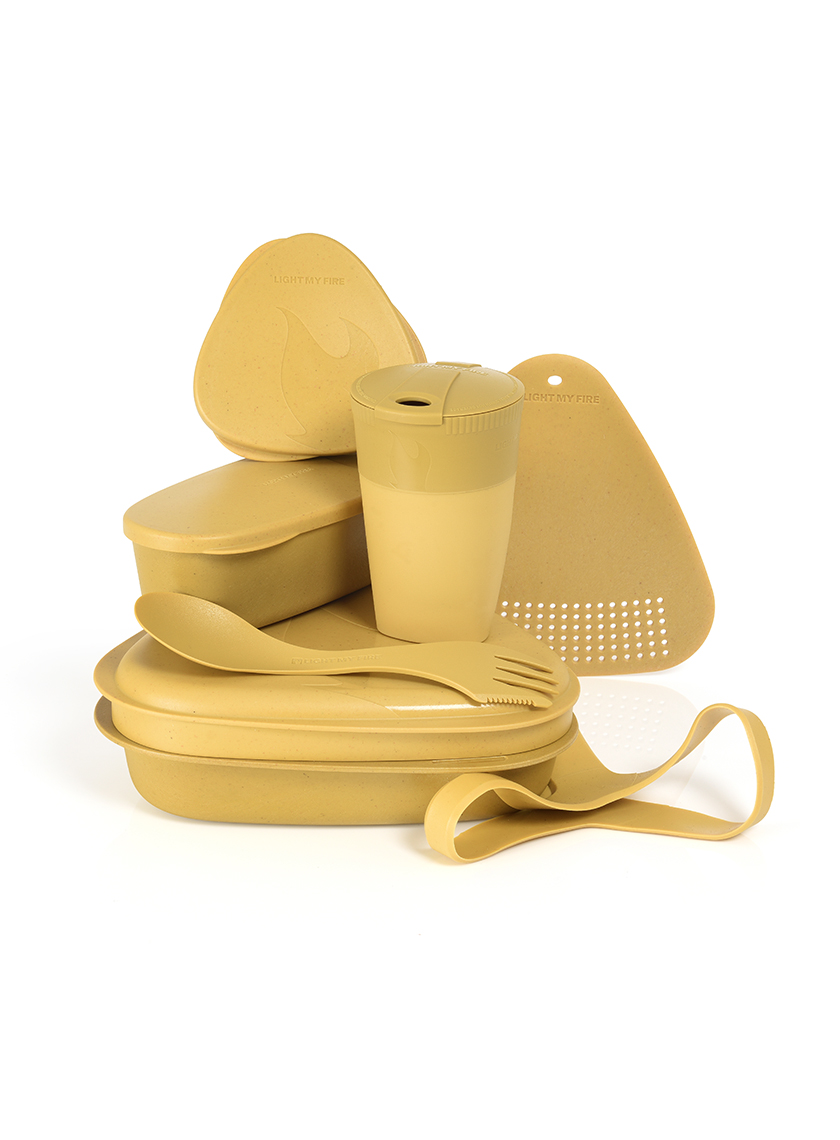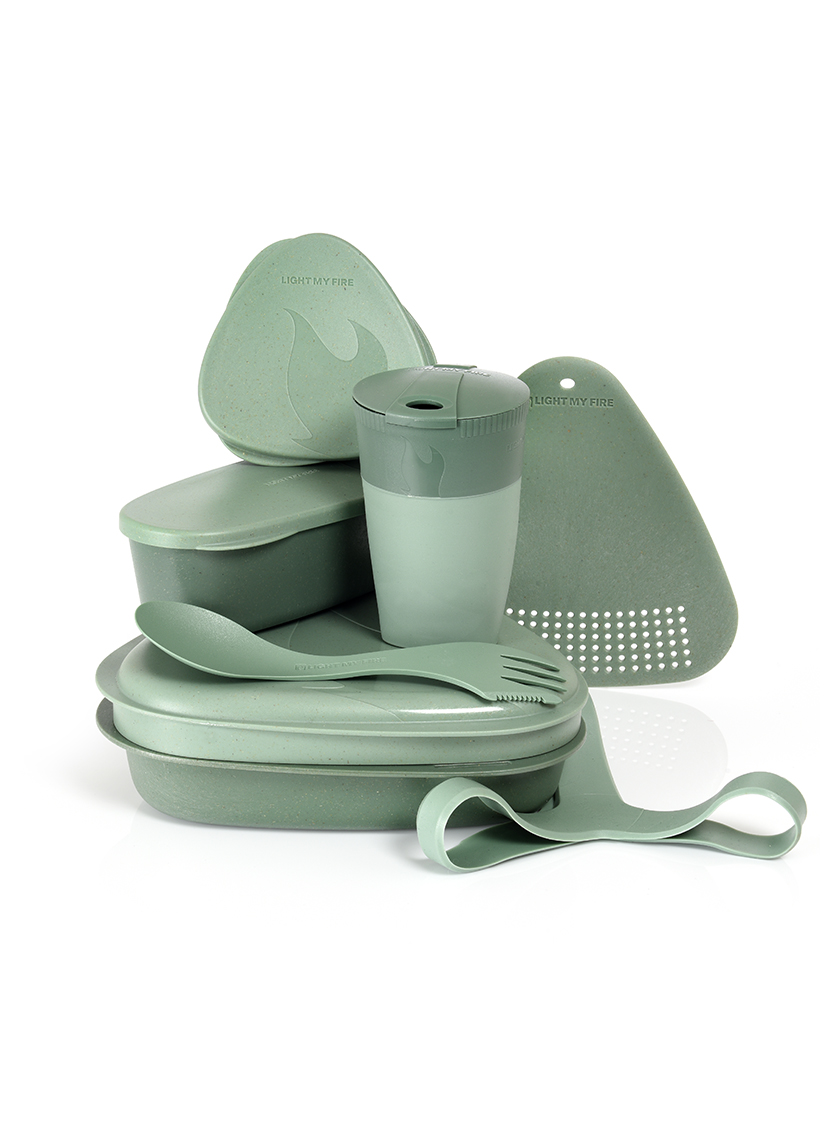 Light My Fire Meal Kit BIO Kestävän kehityksen astiat ulkona ruokailemiseen. Biopohjaisten muovien raaka-aineina ovat sokeriruoko, maissi ja/tai puukuitu. Mukana kaikki mitä tarvitaan: kaksi lautasta, kokoontaitettava muki, lusikka, haarukka, leikkuulauta, veitsi, leikkuulauta, siivilä, kaksi vesitiivistä rasiaa. Kaikki osat pakkautuvat käytännöllisesti sisäkkäin. Myös syvät lautaset ovat nyt pinottavia tilan säästämiseksi. Valmistusmaa Ruotsi. Materiaali- ja valmistusvirhetakuu 2 vuotta.