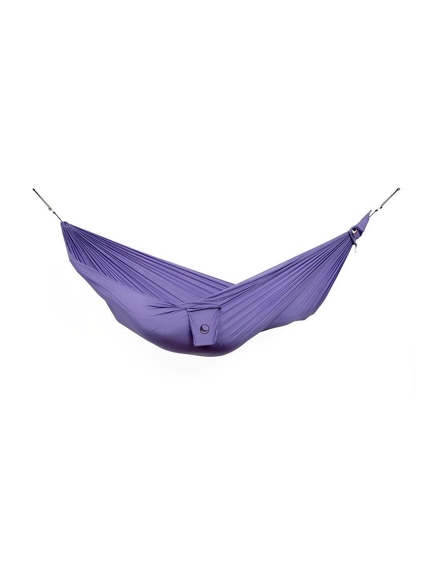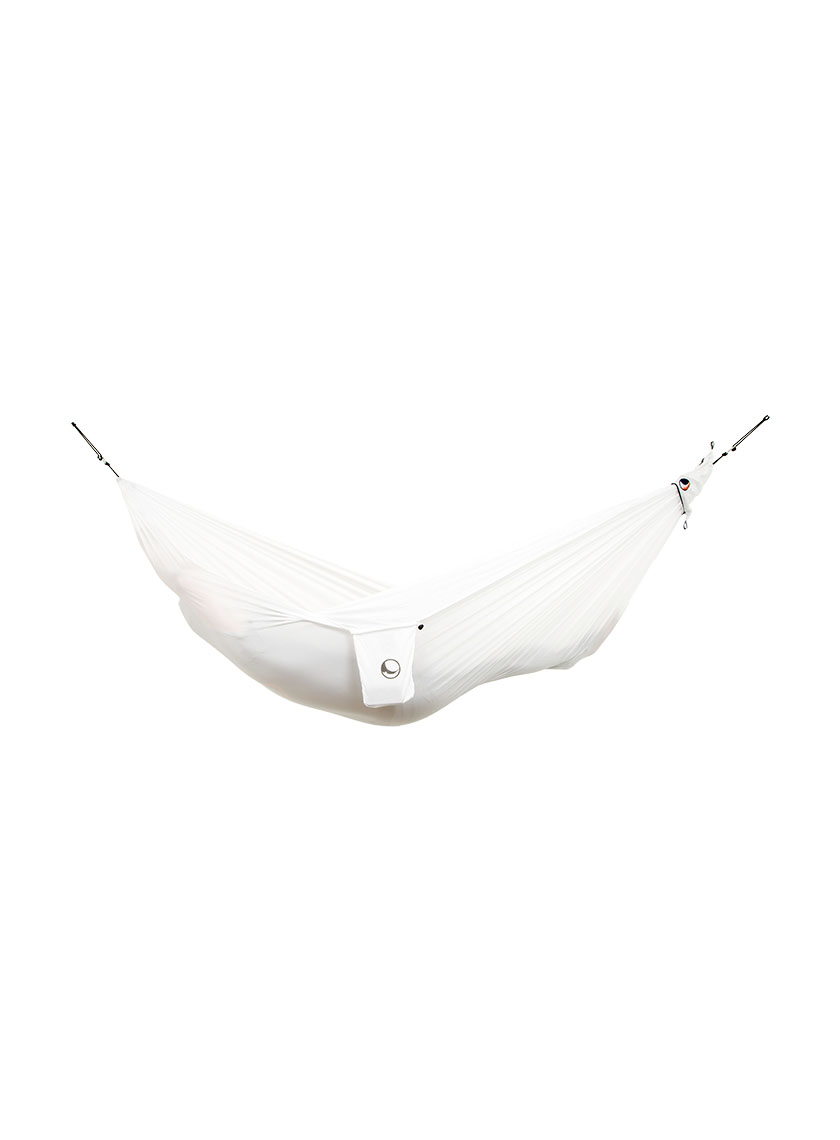 Paino vain 500 g. Kesto 200 kg. Pituus 3,20 m koukusta koukkuun. Makuupituus 2,90 m, leveys 1,55 m. Kuljetuspussin pituus 37 cm, halkaisija 10 cm. Konepestävissä 30C.