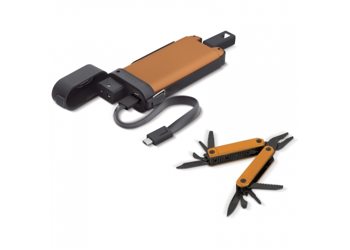 AdventureTop-designia, setti kaikille ulkoilmaihmisille. Sisältää taskulampun 5000mAh lisäakulla sekä 9-toimintoisen monitoimityökalun.