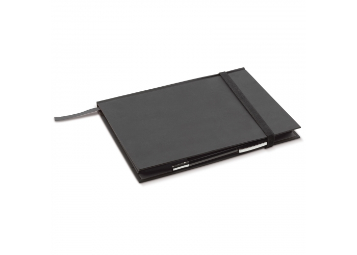 Muistikirja A5, jossa 80 valkoista viivoitettua sivua, kuminauha, kynälenkki ja kirjanmerkki. Hyvä painoala yrityksen logolle.