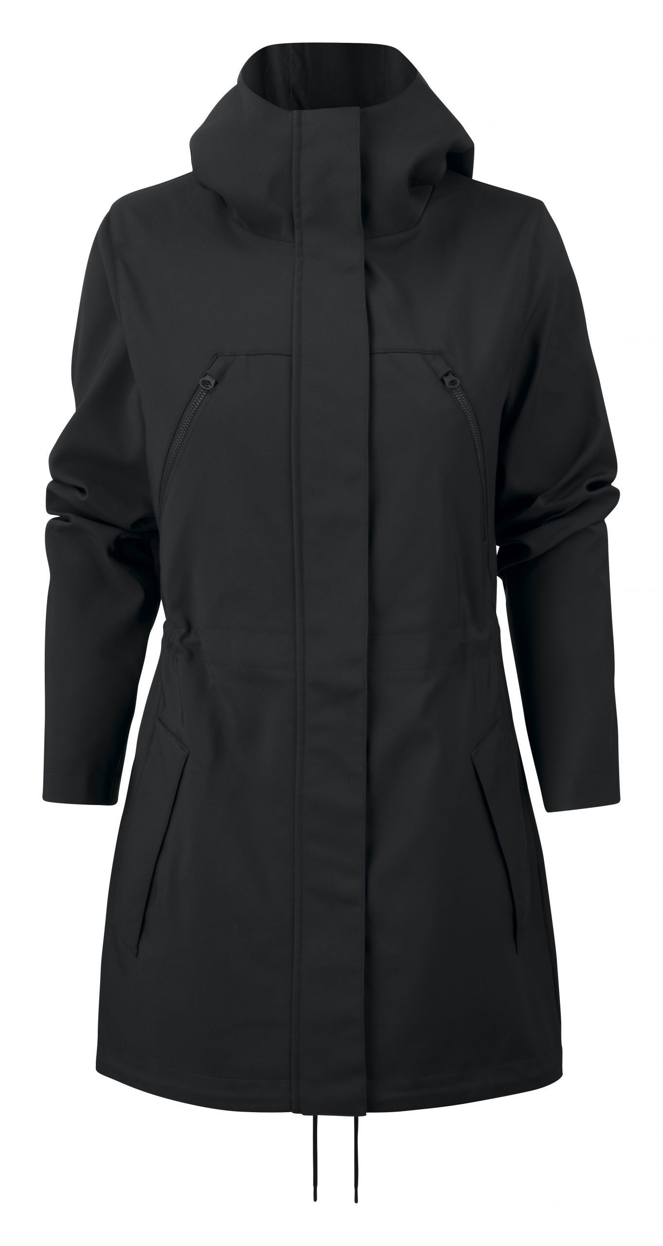 Suojaava huppu ja kiristettavat vyötärönauhat takin sisäpuolella sekä helmassa.