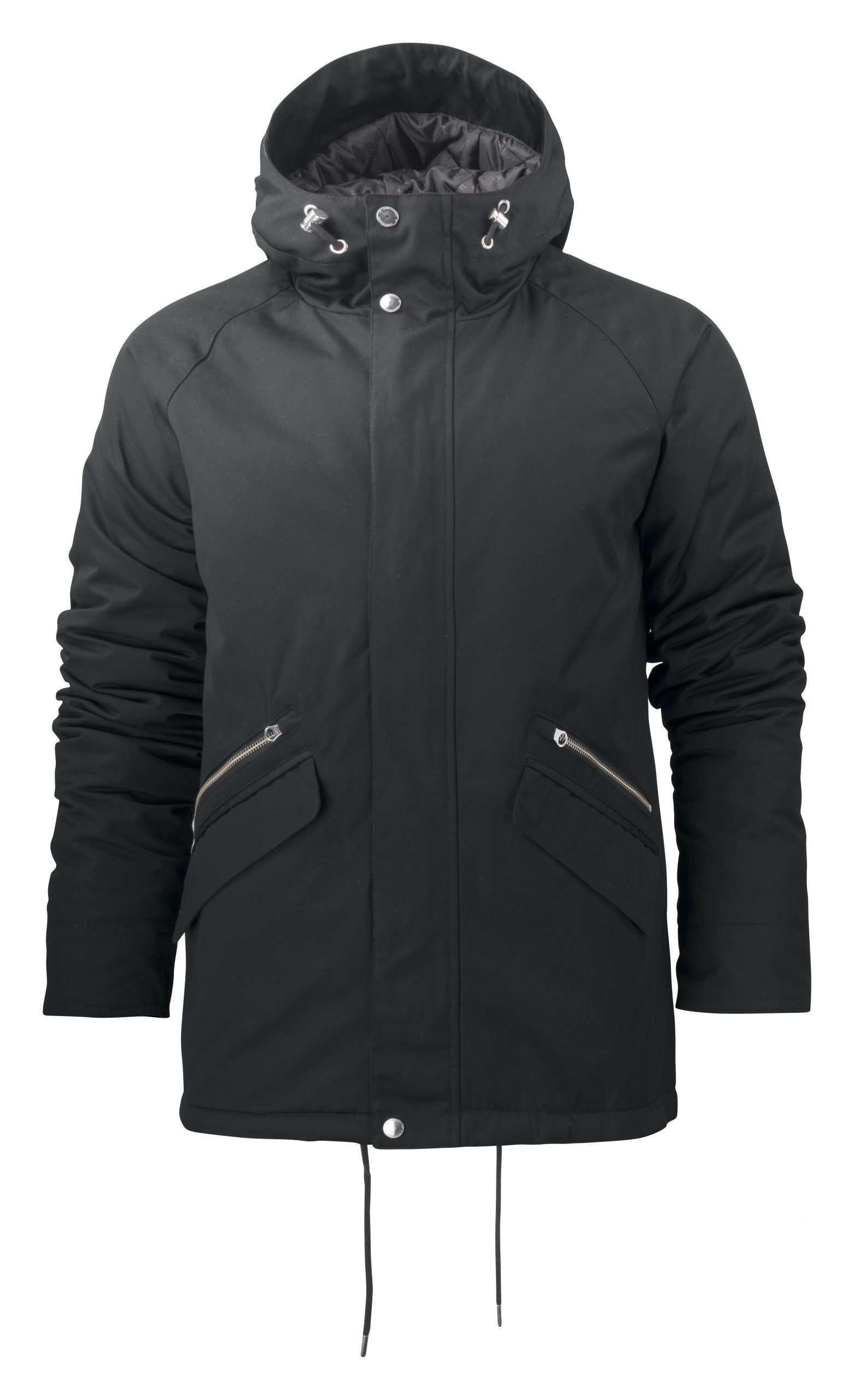 Säädettävät nyörit helmassa ja hupussa.