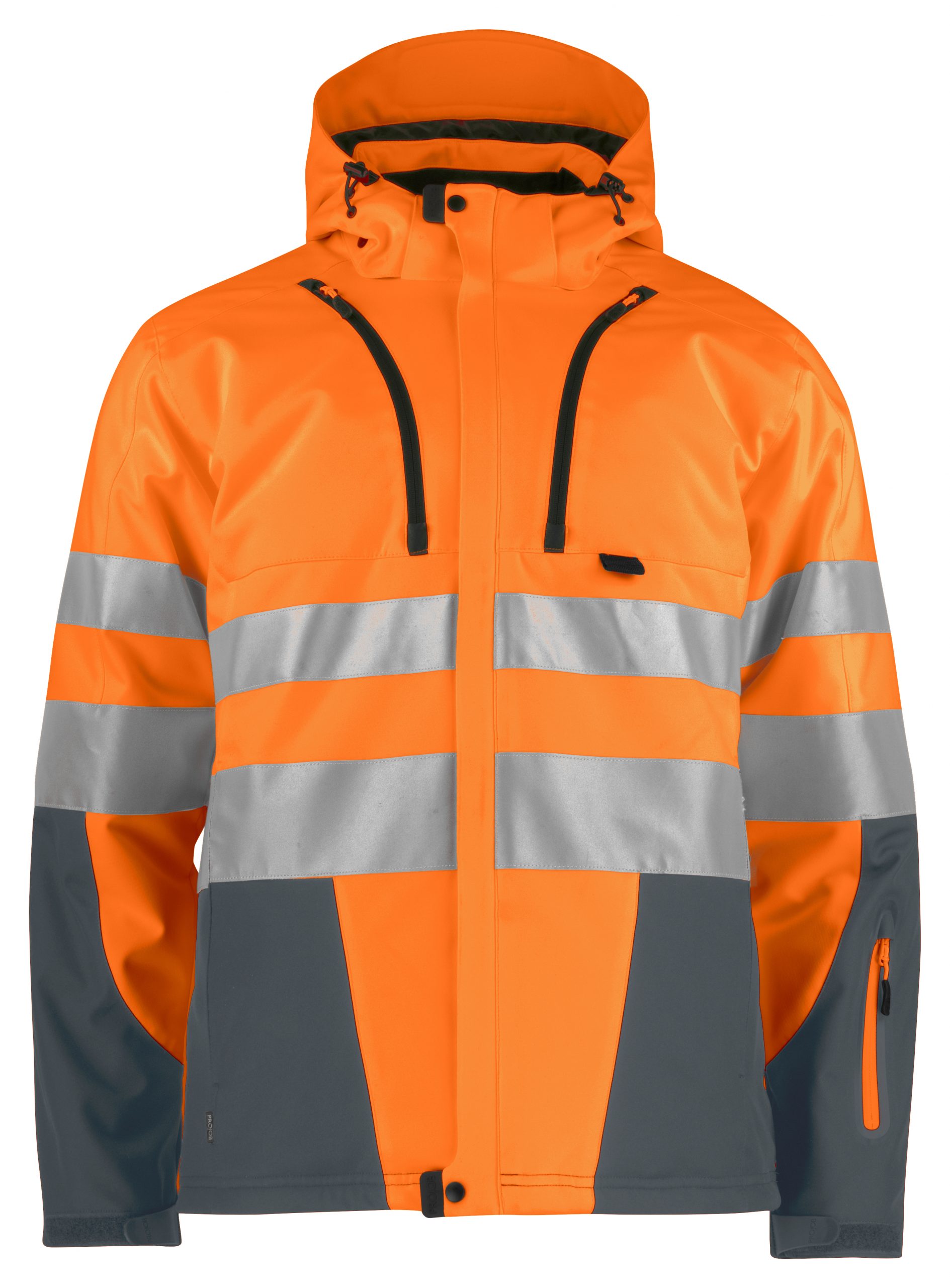 Tuulen- ja vedenpitävä tekninen softshell-huomiotakki. Tikattu toppavuori. EN ISO 20471 LUOKKA 3/2.