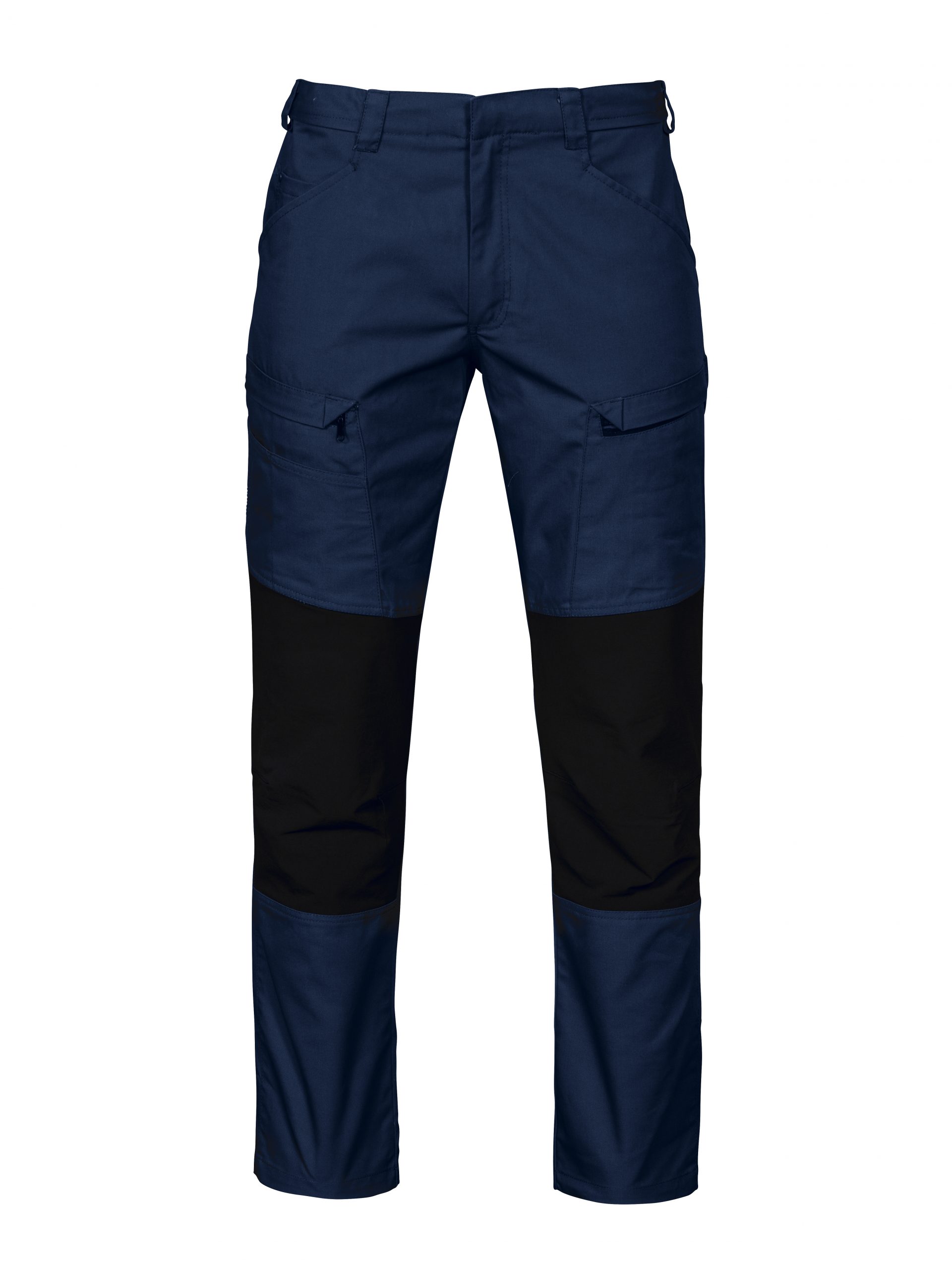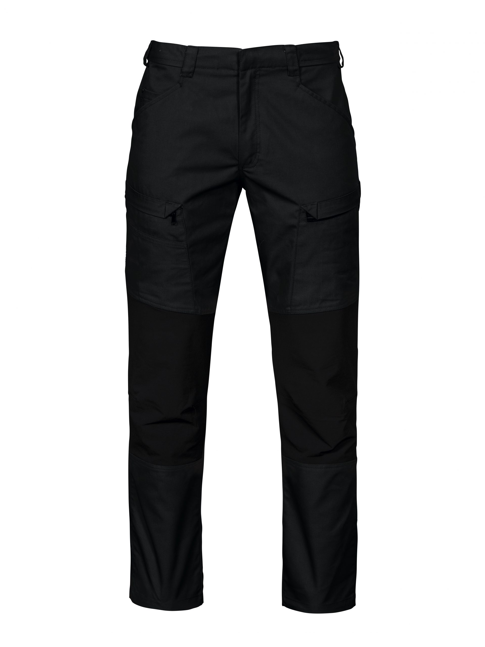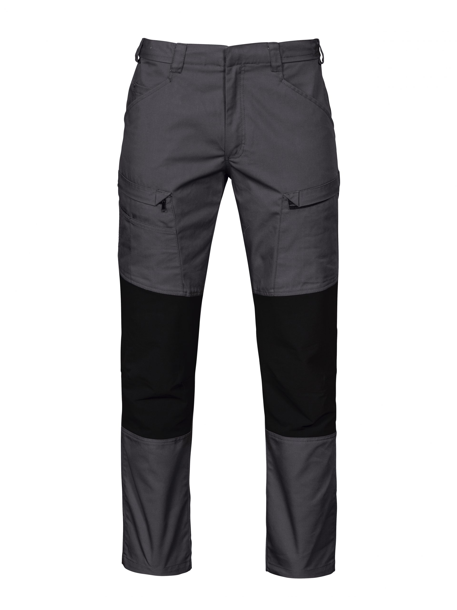 Työhousut, joissa joustavaa kangasta takapuolessa, haaroissa ja polvissa. Kaksi vetoketjullista reisitaskua ja kaksi läpällistä takataskua. Paikat riipputaskuille.