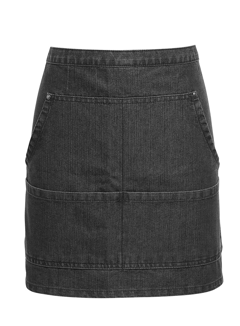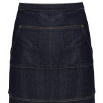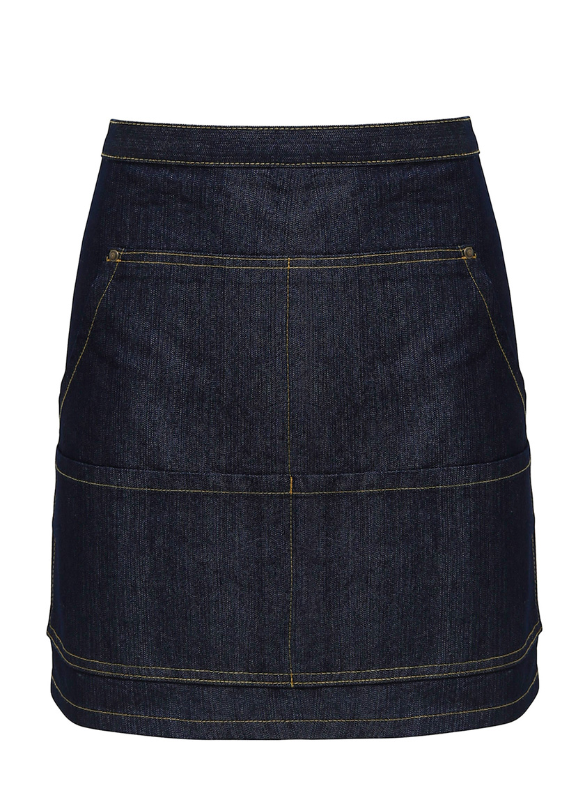 Lyhyt denim essu on tyylikkään rento vaihtoehto essulle. Kontrastiväriset farkkutikkaukset ja metalliniitit. Neljä taskua. Pituus 39,5 cm, leveys 79 cm. 106 cm solmimisnauhat. Laitospesu 85 °C. Kotipesu 60 °C. Pestävä samansävyisten tuotteiden kanssa. Vältettävä kosketusta vaaleiden tekstiilien kanssa.
